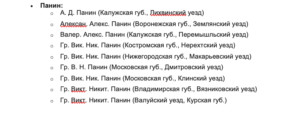 Дальше самая интересная и долгая часть процесса. В "Приложениях" сведения об именах помещиков приведены как Бог на душу положит: "Гр. Дм. Ник. Шереметев", "Граф Дмитрий Николаевич Шереметев", "Гр. Дмитрий Ник. Шереметьев", "Димитрий Ник. Шерем-ьев" — по десятку, а то и больше вариантов одного имени. Как все это унифицировать? Данные уже в таблице, теоретически можно искать каждый вариант поиском по таблице и исправлять его на какой-то унифицированный. Но учтенных помещиков тысячи! Каждого так не унифицируешь, да и сходу в голову не придет искать вместо, например, Олсуфьева какого-нибудь Алсуфева.