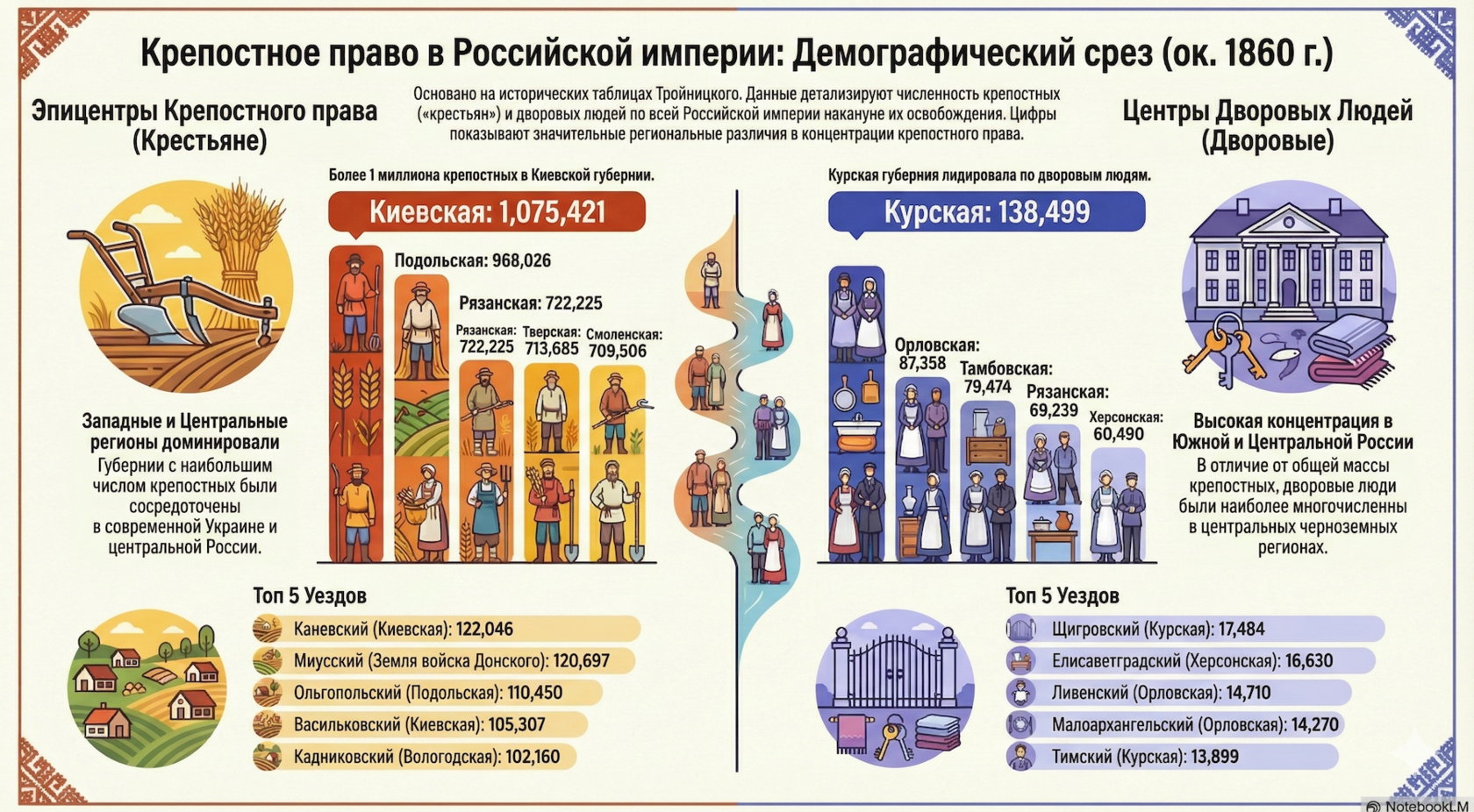 Еще один бонус — ИИ-инфографика от NotebookLM (это тоже Google). Этот ИИ-извод позволяет рисовать инфографику, делать презентации (в т.ч. аудио и видео) на основе загруженных файлов. Тут на входе — excel-табличка на основе данных Тройницкого, а на выходе вот такая картинка.