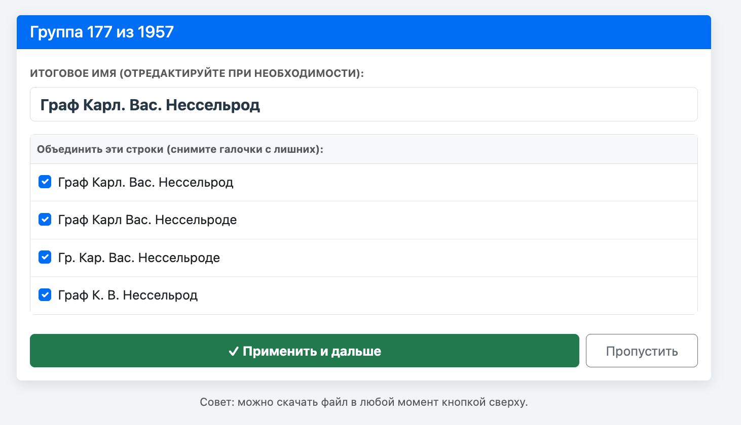 Дальше пришлось объединять или пропускать потенциальные совпадения (тысячи их! но несравнимо быстрее, чем через найти-заменить в Excel), время от времени варьируя степень "возможной похожести". Результат оказался достаточно удобоваримым. Вряд ли удалось объединить всех и вся (например, М. Голицын и Михаил Николаевич Голицын — это один и тот же человек, или нет; такие неочевидные варианты пропускались), но осмысленности и структурности в таблице стало на порядки больше.