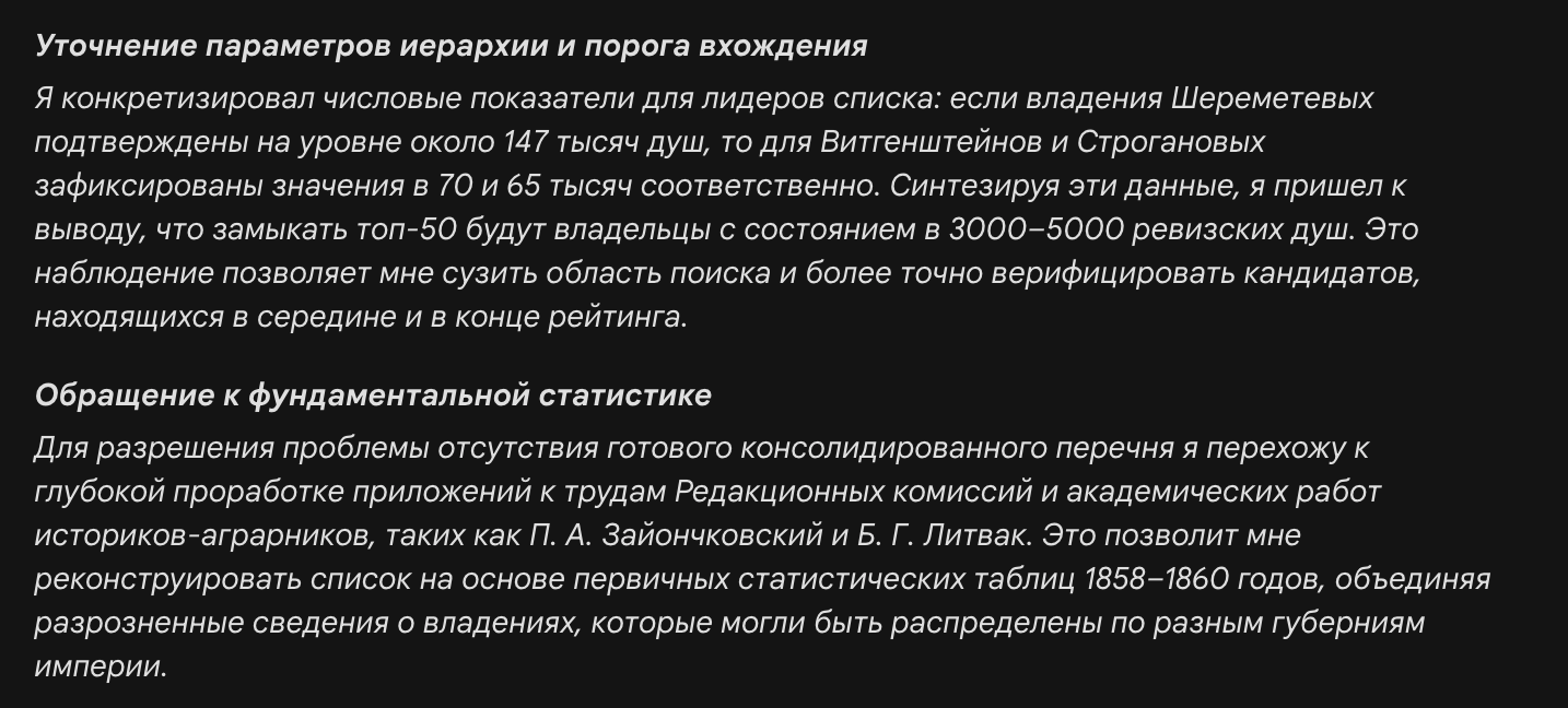 Результат с Deep Research куда интереснее. Он искал данные минут 20, в процессе рассуждения бросался такими фразами: "Я приступаю к анализу структуры землевладения накануне отмены крепостного права, сосредоточившись на данных 10-й народной переписи 1858 года и материалах Редакционных комиссий 1860 года", "Для разрешения проблемы отсутствия готового консолидированного перечня я перехожу к глубокой проработке приложений к трудам Редакционных комиссий и академических работ историков-аграрников, таких как П. А. Зайончковский и Б. Г. Литвак.